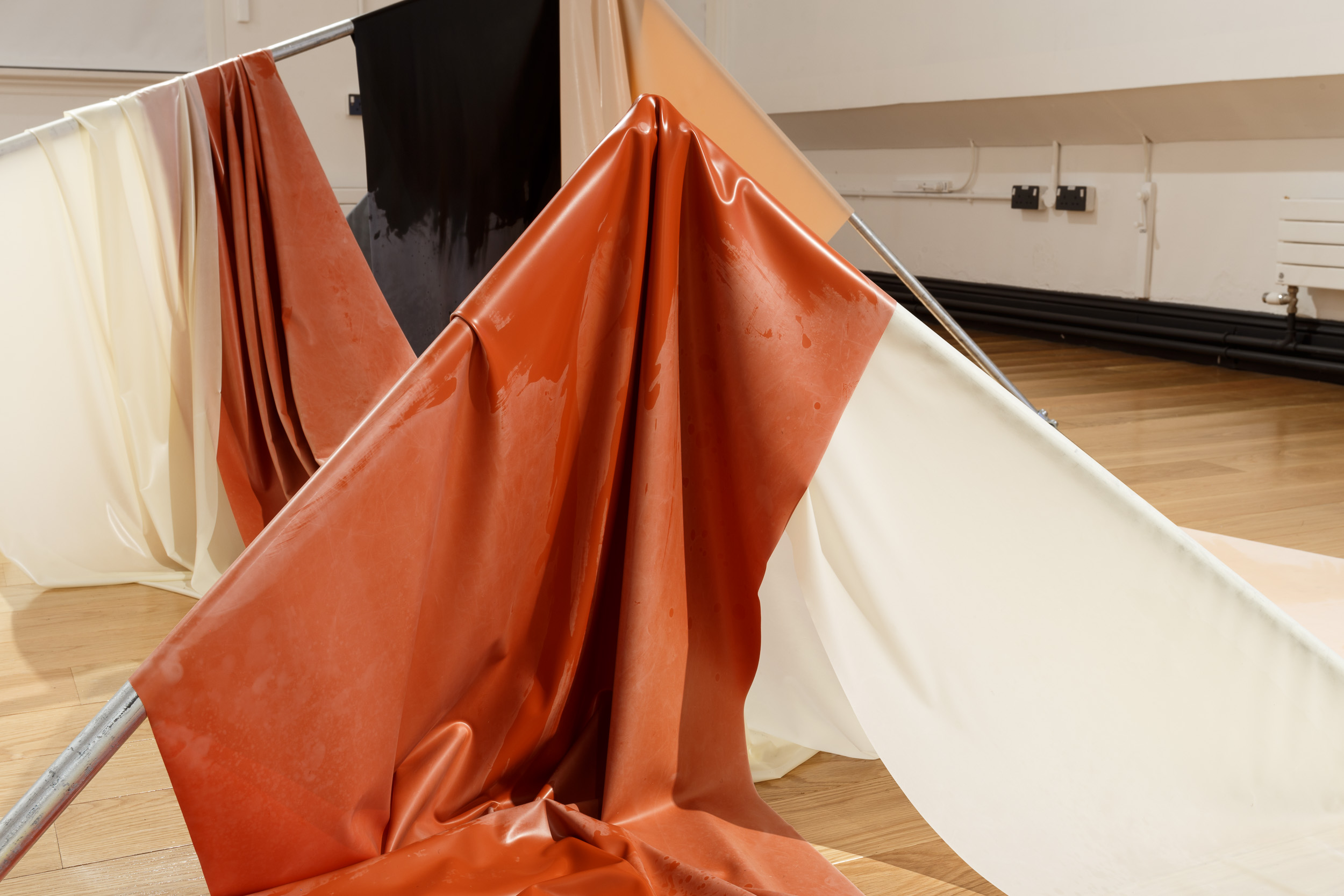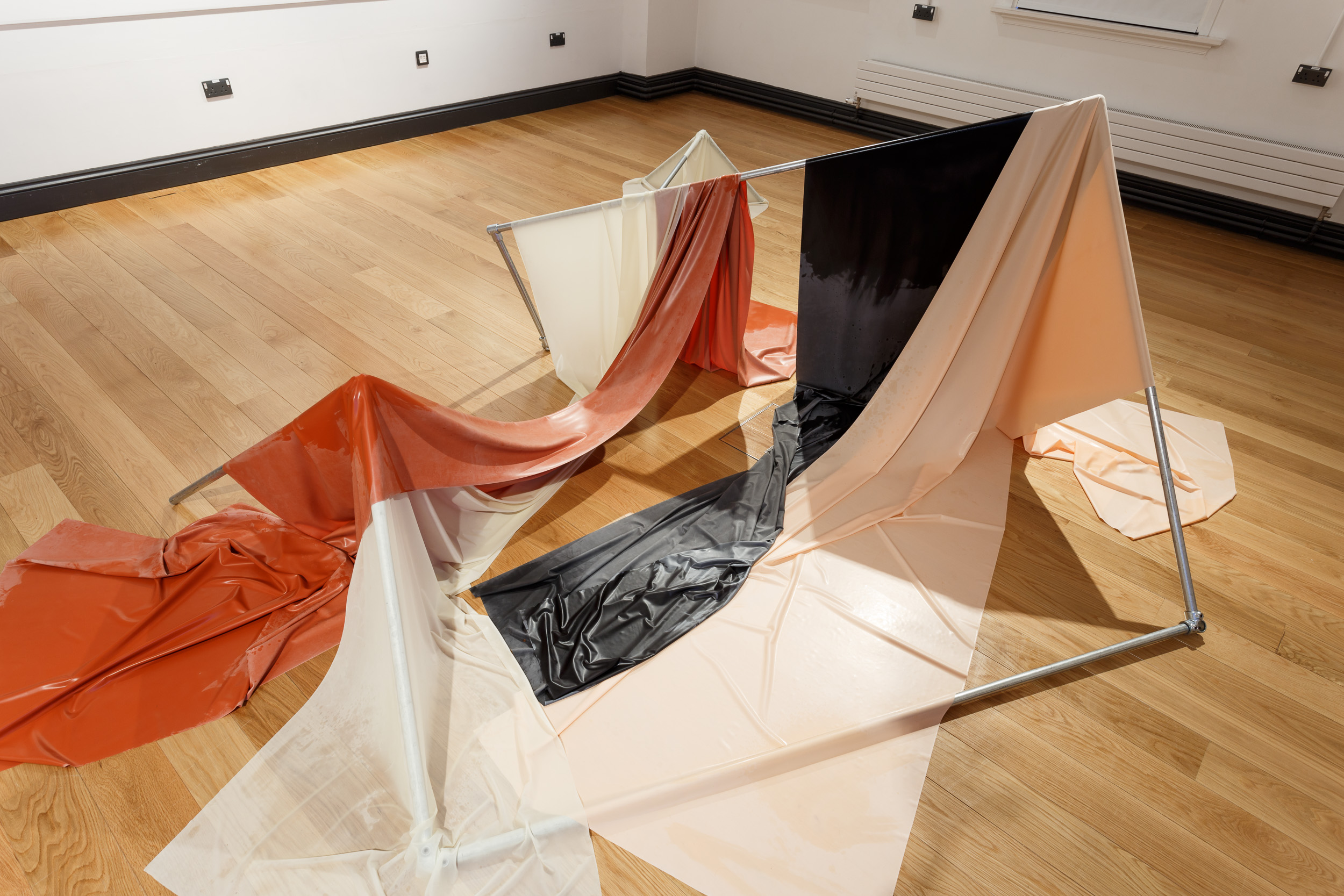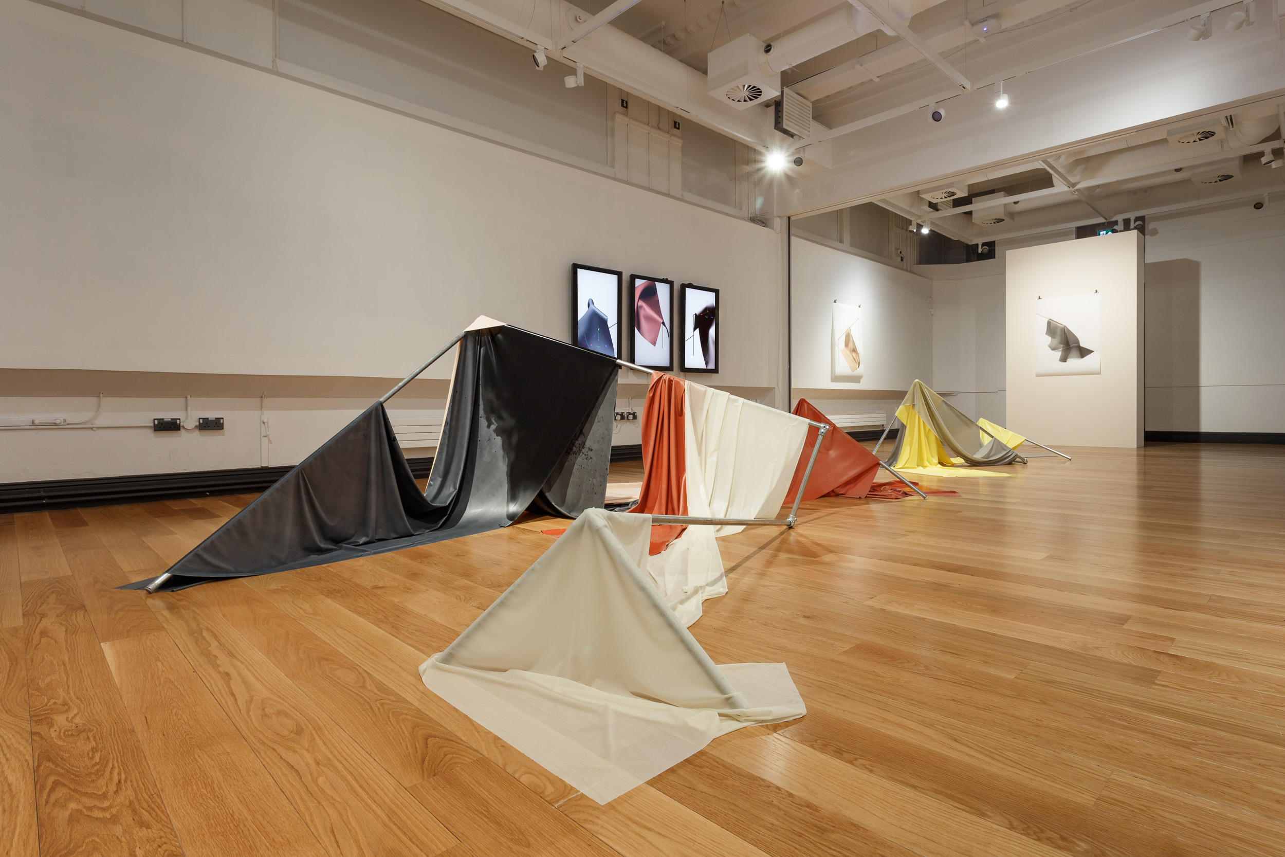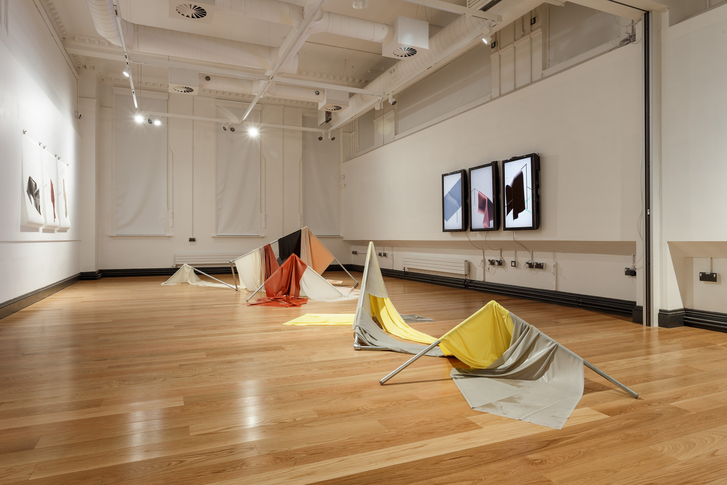 Installation of sculptural forms, digital prints and 3D rendered videos by Bethan Hughes.